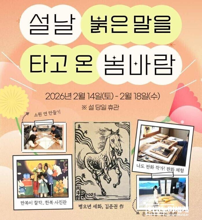 세화(歲畵)는 새해를 맞아 액운을 막고 복을 기원하기 위해 집안에 붙이던 그림으로, 조선시대부터 이어져 온 대표적인 설 풍속이다. 이번 프로그램에서는 병오년을 상징하는 ‘붉은 말’의 이미지를 활용해 관람객이 직접 판화를 찍어볼 수 있도록 했다.