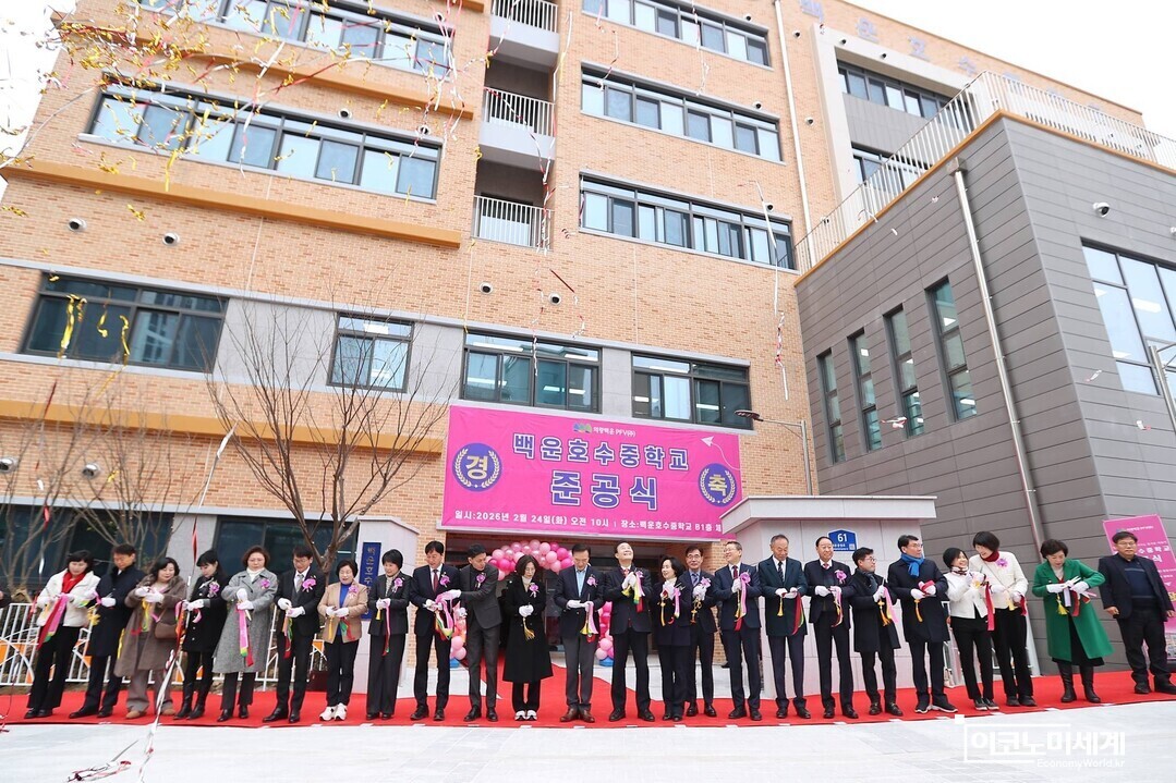 이날 백운밸리 일대에서 열린 백운호수중학교 준공식은 지역 주민과 교육계 관계자들에게 남다른 의미를 남겼다. 2024년 10월 착공 이후 1년 4개월이라는 짧지 않은 시간 동안 이어진 공정은 ‘가능성’에 대한 의문과 싸우는 과정이었다.
