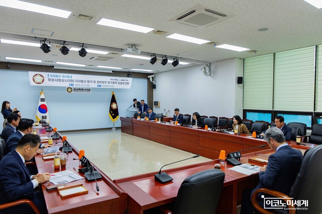 [이코노미세계] 화성특례시의회 의원연구단체 ‘자치법규 연구회’가 10월 17일 상임위원회 회의실에서 연구용역 최종보고회를 열었다. 이번 연구는 단순히 조례를 정비하는 수준을 넘어, 지방자치의 실효성과 시민 권익 보호를 위한 법적 기반을 새롭게 구축하겠다는 취지로 추진됐다.