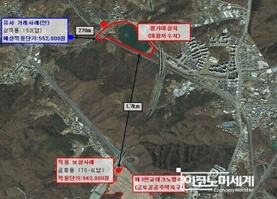 부동산 감정가 산정에서 ‘표준지’는 핵심 기준이다. 감정평가사는 대상 토지와 가장 유사한 인근 토지를 표준지로 삼아 가격을 산정한다. 하지만 이번 경우, 대왕저수지 인근 유사 지형이 아닌 수 킬로미터 떨어진 전·답이 표준지로 지정된 것으로 알려졌다.