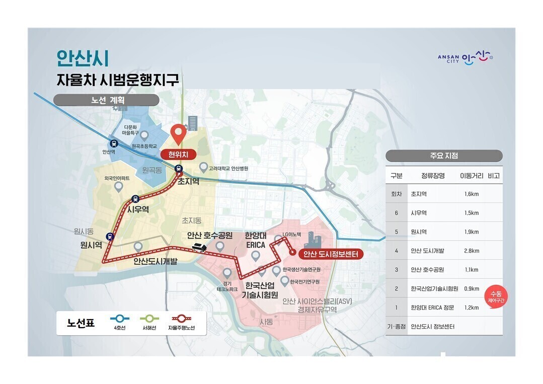 시범운행지구는 단원구 초지동과 상록구 사동 일대를 잇는다. 산업단지와 주거지역, 상업지구, 대학·연구기관을 하나의 동선으로 연결하는 구조다. 내년 중 자율주행 자동차가 본격 시범운행에 들어갈 예정이며, 안산시 도시정보센터를 출발해 한양대 ERICA 캠퍼스, 한국산업기술시험원, 안산호수공원, 원시역·초지역 등을 잇는 약 11km 구간이 주요 노선으로 설정됐다.