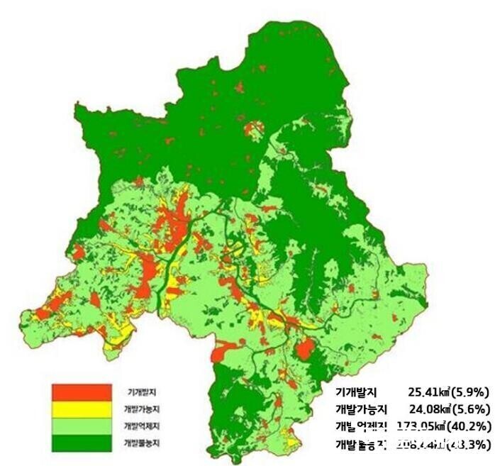광주시는 도시계획 논의에서 늘 ‘규제’라는 단어와 함께 언급돼 왔다. 시 전역이 특별대책지역, 자연보전권역으로 지정된 데다 개발제한구역, 상수원보호구역, 수변구역, 군사시설보호구역 등 각종 규제가 중첩돼 있다. 전체 면적의 65%가 임야로 구성된 점 역시 도시 확장성을 제한하는 요소다. 시가 “개발 가용지가 부족하다”고 진단하는 배경이다.