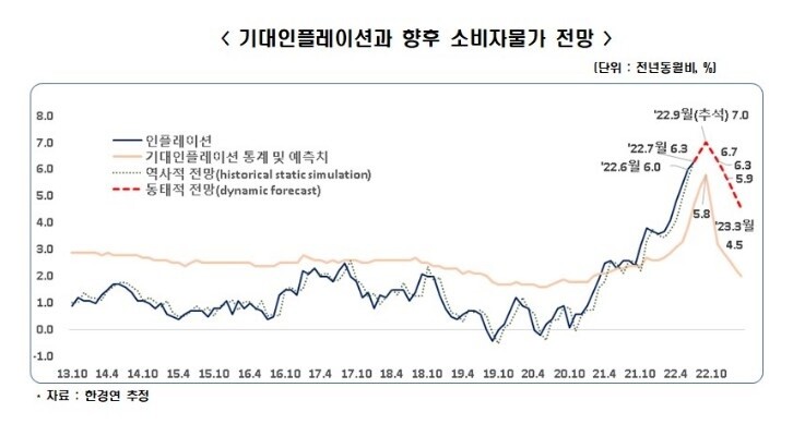 또한 향후 기대인플레이션이 올 추석이 있는 9월을 정점으로 둔화되는 것으로 가정한 후 소비자물가를 전망해보았다. 분석결과, 소비자물가는 기대인플레이션이 진정된다면 9월 7.0%를 정점으로 당분간 5% 후반에서 6% 후반대로 급등세가 꺾이는 것으로 나타났다.