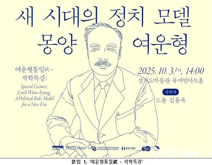 이번 프로그램 가운데 가장 주목받는 행사는 철학자 도올 김용옥 박사가 진행하는 석학 특강이다. 10월 3일 오후 2시 경기도박물관 뮤지엄아트홀에서 열리는 이번 강연은 ‘새 시대의 정치 모델 몽양 여운형’을 주제로 진행된다. 강연은 광복 80주년을 기념해 기획된 특별전 ‘여운형: 남북통일의 길’과 연계해 마련됐다.