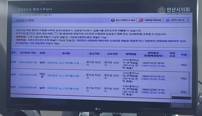박 의원은 나라장터에서 확인한 결과 “2022년 12월 12일 공고, 1회 유찰 이후에 재입찰 공고를 내면서 행정적으로 부적절 하므로 지방계약법 제19조 3항 위반이라고 질타했다.